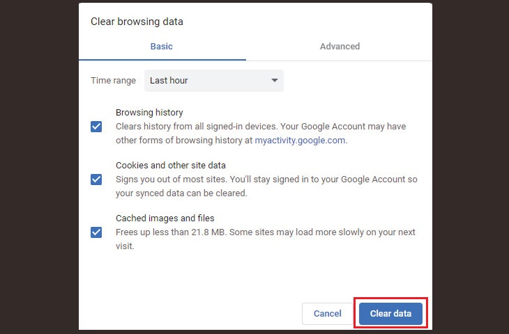 Bước 3: Cuối cùng, chọn Xoá dữ liệu (Clear data) là bạn có thể xóa bộ nhớ cache và cookies của trình duyệt.