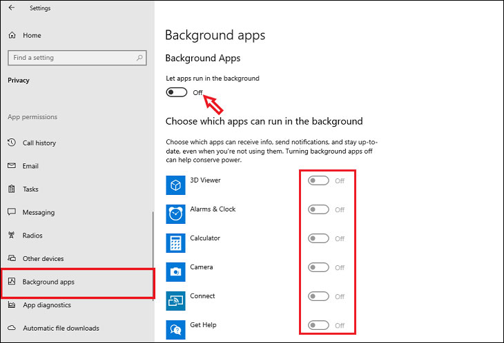 Bước 2: Sau đó, đi đến mục Background apps. Tại đây sẽ hiển thị danh sách của toàn bộ các ứng dụng đang chạy ngầm trên máy tính. Có hai cách để thực hiện việc tắt các ứng dụng ngầm trên máy: