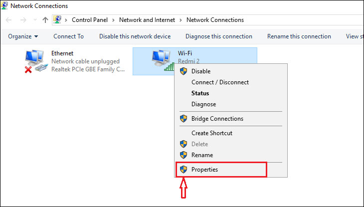 Bước 3: Click chuột phải vào mạng Wi-Fi mà bạn đang sử dụng > Chọn Properties.