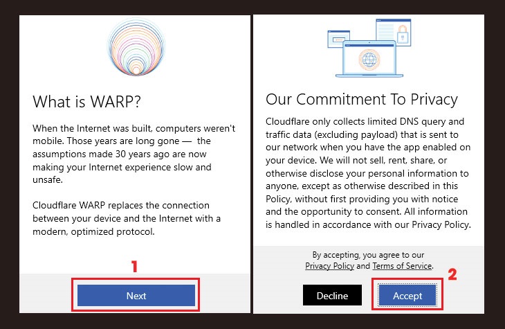 Bước 3: Sau khi được cài đặt xong, máy tính của bạn sẽ nhận được thông tin giới thiệu về ứng dụng WARP. Lúc này, bạn nhấn Next > Accept.