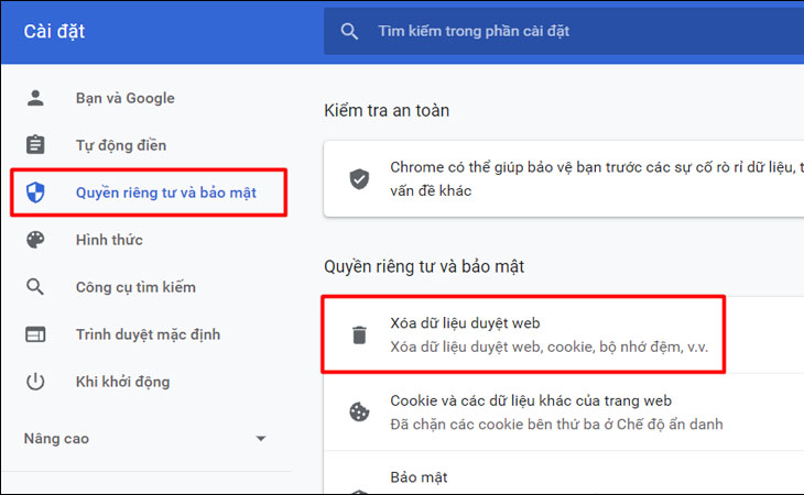 Bước 2: Trong giao diện Cài đặt > Chọn Quyền riêng tư và bảo mật (Privacy and security) > Xoá dữ liệu duyệt web (Clear browsing data).